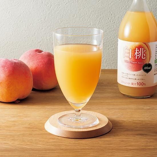 国産の白桃を使用したストレートジュース。傷があるものや小さいサイズの白桃を有効活用しています。開栓時は栓抜きが必要です。